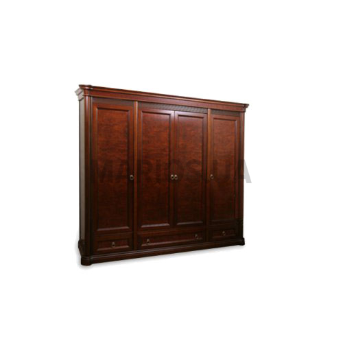 Шкаф очень практичный и многофункциональный, потому что имеет не только четыре створки, а еще и четыре ящика, находящихся внизу изделия. Модель изготовлена в коньячном цвете из качественного материала - ольха.