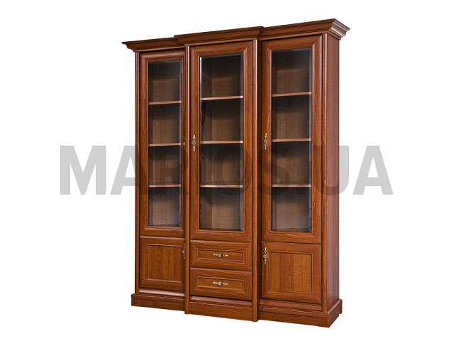 Трехдверный гардеробный шкаф с полками для одежды, выдвижными ящиками и стеклянными панелями. Резные цоколи и утонченная фурнитура в цвете латунь. Из элементов модульной системы можно укомплектовать прихожую, спальню, гостиную и кабинет.