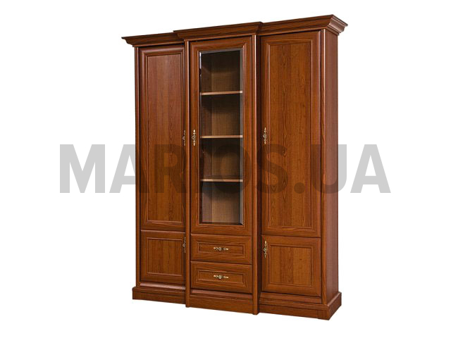 Трехдверный гардеробный шкаф с полками для одежды, выдвижными ящиками и стеклянной панелью. Резные цоколи и утонченная фурнитура в цвете латунь. Из элементов модульной системы можно укомплектовать прихожую, спальню, гостиную и кабинет.