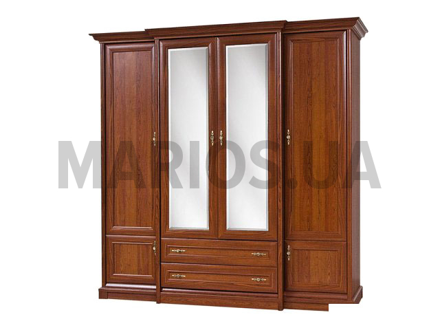 Четырехдверный гардеробный шкаф с полками для одежды, выдвижными ящиками и стеклянными панелями. Два больших зеркала прямоугольной формы. Резные цоколи и утонченная фурнитура в цвете латунь. Из элементов модульной системы можно укомплектовать прихожую, спальню, гостиную и кабинет.