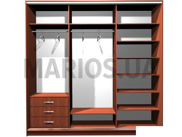 45.00см x 240.00см x 240.00см Характеристики шкафа Количество дверей 3 Материал корпуса ДСП 16 мм, кромка ПВХ 0,5 и 2 мм, направляющие телескопические Оснащение 10 полок, 3 ящика, 2 двери из ДСП и 1 дверь с фотопечатью Форма шкафа линейная Шкаф-купе Ника-2 240х45х240 ДСП/Фотопечать - многофункциональный шкаф с тремя секциями. Одна секция шкафа оборудована полочками, вторая состоит из 3 ящиков и отделения для тремпелей и третья секция оборудована одной полочкой и отделением для тремпелей. Используемые материалы: ламинированное ДСП (16мм), кромка ПВХ (2 и 0,5мм), направляющие телескопические. Раздвижная система ADS. Размеры шкафа-купе Ника 2 Высота, см Ширина, см Глубина, см 240 240 45 Цена указана за корпус шкафа в стандартной цветовой гамме с двумя дверями из ДСП и одной дверью с фотопечатью. Стоимость изготовления шкафа в нестандартной цветовой гамме оплачивается дополнительно.