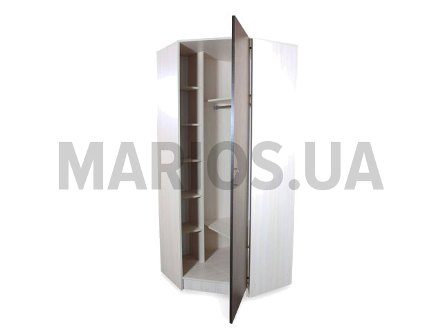 Шкаф угловой Ника 50/6 Левая сторона шкафа - открытые полки в количестве шести штук, правая - штанга для висящей одежды, полка в верхней и нижней части шкафа. Материалом изготовления является ламинированный ДСП (16мм). Вы можете заказать любой из стандартных цветов. Размеры Комплекс-1 шкаф угловой Глубина, см Ширина, см Высота, см 80 80 200