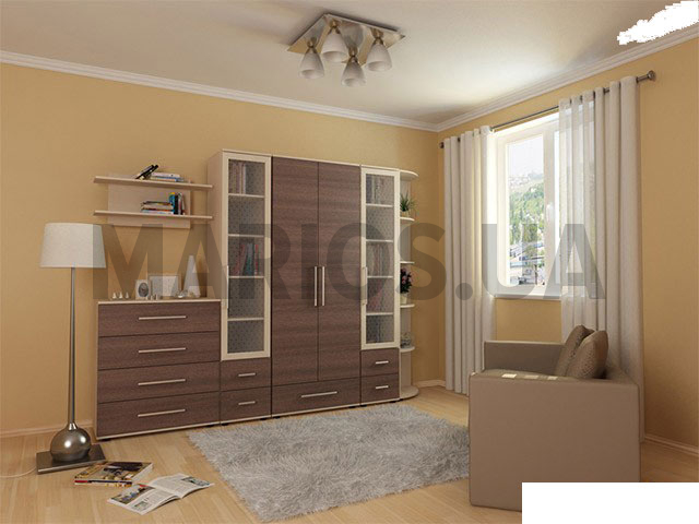 Система Карина-1 - мебельный гарнитур, который можно расположить в небольшой гостиной Вашего дома или в детской комнате. Вместительный шкаф будет полезен для складывания одежды. Стеллажи со стеклянными дверцами упорядочат Ваши книги, альбомы и журналы. На угловом стеллаже красиво будут смотреться сувениры и рамочки с фотографиями. В состав системы входит: два шкафа КМ-06 стекло Карина;стеллаж КМ-11 Карина;полка КМ-08 Каринакомод КМ-10 Карина;шкаф гарберобный КМ-1 Карина. В качестве материалов используются: ДСП 16мм немецкого концерна "Кроно Украина" с горизонтальной текстурой, торцы деталей оклеены ПВХ-кромкой фирмы MAAG. Ручки и ножки цвета "матовый алюминий". Доступны следующие варианты цветового исполнения: корпус "клен ванкувер", фасад "морская трава";корпус "клен ванкувер", фасад "ясень шимо";корпус "венге", фасад "морская трава";корпус "венге", фасад "ясень шимо". Размеры шкафа КМ-01 Карина Ширина, см Глубина, см Высота, см 80,0 41,0 210,0Размеры комода КМ-10 Карина Ширина, см Глубина, см Высота, см 82,4 41,0 95,5 Размеры полки КМ-08 Карина Ширина, см Глубина, см Высота, см 82,4 22,0 41,0Размеры шкафа КМ-06 стекло Карина Ширина, см Глубина, см Высота, см 40,0 41,0 210,0Размеры стеллажа КМ-11 Карина Ширина, см Глубина, см Высота, см 41,0 41,0 210,0