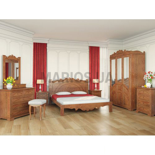 Характеристики мебели Материал натуральное дерево Спальня Антена. Включает в себя: Двуспальную кровать 160х200 см. Трехдверный шкаф. Трюмо. Пуф. Комод. Прикроватные тумбочки (2шт). Размеры кровати: длина - 200 см; ширина - 160 см; высота - 112 см. Размеры шкафа: глубина - 64 см; ширина - 151 см; высота - 212 см. Размеры трюмо: глубина - 49 см; длина - 100 см; высота - 181 см. Размеры комода: глубина - 49 см; ширина - 72 см; высота - 82 см. Размеры тумбы прикроватной: глубина - 35 см; ширина - 50 см; высота - 54 см. Материал: натуральное дерево.