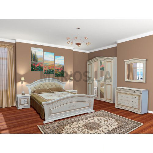 Характеристики мебели Материал ДСП, МДФ Спальня Николь патина 4Д В состав комплекта входит: Двуспальная кровать 160х200 - 183,5х209,5х114,5 смКомод - 107х47х85,5 смПрикроватная тумба 2шт - 46х44х52 смШкаф 4Д - 184х58х230 смЗеркало - 89,5х3,5х93 см Матрас к двуспальной кровати можно купить здесь Цвет фасада - МДФ белое дерево, патина Цвет корпуса - ДСП белое дерево