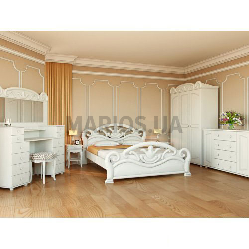 Характеристики мебели Материал натуральное дерево Спальня Риана. Включает в себя: Двуспальную кровать 160х200 см. Трехдверный шкаф. Трюмо. Комод. Прикроватные тумбочки (2шт). Размеры кровати: длина - 200 см; ширина - 160 см; высота - 108 см. Размеры шкафа: глубина - 61 см; ширина - 146 см; высота - 209 см. Размеры трюмо: глубина - 48 см; длина - 145 см; высота - 193 см. Размеры комода: глубина - 48 см; ширина - 119 см; высота - 80 см. Размеры тумбы прикроватной: глубина - 36 см; ширина - 46 см; высота - 55 см. Материал: натуральное дерево.