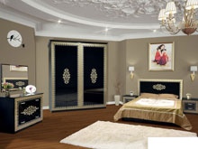Характеристики мебели Материал ДСП Спальня София 4Д В состав комплекта входит: Двуспальная кровать 160х200 - 208х168х118 смКомод - 104х46х80,5 смПрикроватная тумба 2шт - 54х41х51,5 смШкаф 6Д - 184х62х221Зеркало - 88х2,3х104 см Матрас к двуспальной кровати можно купить здесь Цвет фасада - ДСП черный/ белый, лак, художественная печать Цвет корпуса - ДСП черный/ белый