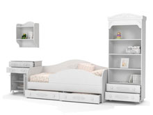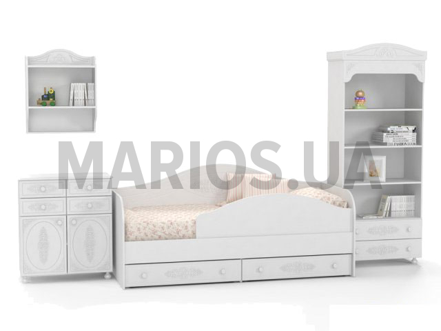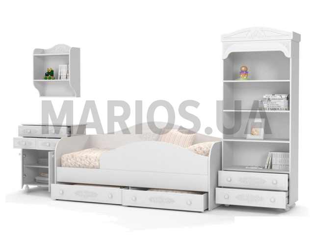 Характеристики мебели Материал ДСП, МДФ Спальный гарнитур Ассоль-1. Включает в себя: Кровать-диван АС-10 с бортиком. Размеры: ширина - 85 см; длина - 204 см; высота - 95 см. Модель оснащена подкроватными ящиками и защитным бортико от падения. Комода АС-18. Размеры: ширина - 80 см; глубина - 43 см; высота - 90 см. Полка универсальная АС-15. Размеры: ширина - 60 см; глубина - 26 см; высота - 75 см. Пенал открытый АС-03. Размеры: ширина - 83 см; глубина - 40 см; высота - 206 см. Ручки – фигурные. Материал фасадов: фирменная текстура 3D. Материал корпуса: ДСП ламинированное 18 мм. Цвет: белый.
