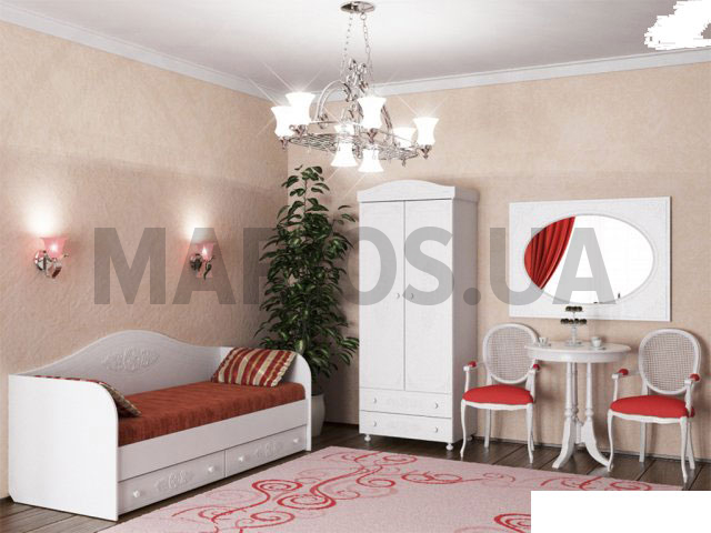 Характеристики мебели Материал ДСП, МДФ, ПВХ Белый спальный гарнитур для девочки Ассоль-2 – это настоящая находка для детской комнаты! Эстетичная и качественная, она наполнит Вашу жизнь новыми эмоциями и доставит невиданное удовольствие Вашему ребенку. В ней есть все необходимое. Кровать-диван АС-10 Ассоль поможет экономить свободное пространство, являясь, при этом, полноценным спальным местом с ящиками для хранения белья или игрушек. Детская мебель для комнаты девочки подростка выполнена из качественного ДСП и МДФ. Использование данных материалов в производстве позволило украсить фасады нежными узорами и сделать минимальную себестоимость для такого шикарного на вид гарнитура. В тоже время репутация производителя фабрики Компасс говорит о том, что мебель не только красивая и недорогая, но и очень качественная. В комплект детской мебели Ассоль-2 входит: Кровать-диван АС-10 АссольШкаф двухдверный АС-02 АссольЗеркало АС-08 Ассоль Размеры кровати-дивана АС-10 Ассоль: ширина: 95 см;высота: 85,5 см;длина: 203,8 см. Размеры шкафа двухдверного АС-02 Ассоль: ширина: 83, 2 см;высота: 210 см;глубина: 51, 6 см. Размеры зеркала АС-08 Ассоль: ширина: 100 см;высота: 80 см;глубина: 3,2 см. Материалы: модули изготовлены из ДСП 16 мм;применяются МДФ фасады;торцы деталей обклеиваются ПВХ-кромкой. Особенностью является применение технологии объемного нанесения узора. Ручки – фигурные. Вы также можете приобрести каждый элемент гарнитура Ассоль по отдельности.