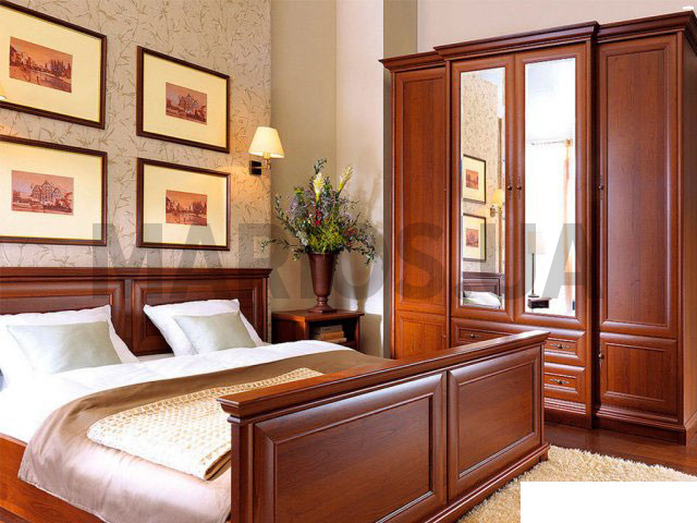 Характеристики мебели Материал ЛДСП, МДФ. Спальный гарнитур Соната - 2 Характеризуется изысканным дизайном цоколей, карнизов и дверок, стеклами с фрезерованными краями и утонченными патинированными ручками. Цвет: каштан. Материал: Корпус: ЛДСП. Фасад: МДФ. Состоит из: Кровать 160 (каркас) Размеры изделия: (Ш/В/Г) - 176.5/83.5/210 см. Шкаф 4d/2s Размеры изделия: (Ш/В/Г) - 227/225/66 см. Дополнительно можно доукомплектовать прикроватной тумбой с двумя выдвижными ящиками.