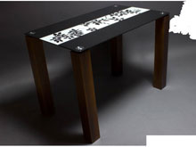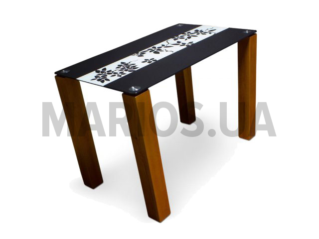 Столешница покрашена в черно-белой гамме в виде россыпи цветов вдоль строгих полос. Но по Вашему желанию можно подобрать другое цветовое решение для столешницы. Изюминкой стола является крашенный рисунок столешницы, а прочные ножки придают устойчивости.