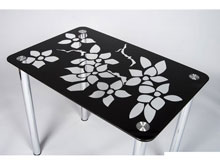 Стол изготовлен из прочных и долговечных материалов. Столешница изготовлена из крашенного закаленного стекла толщиной 8мм. Красивейший рисунок в виде белых цветов на черной поверхности, нанесенный на нее, делает стол современным и стильным. В качестве устойчивых опор используется металлическая хромированная труба диаметром 50мм. Сочетание стекла и металла, делают стол надежным и практичным.