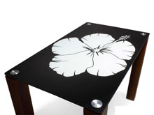 Столешница окрашена в черный цвет и является фоном, на который нанесен белый цветок лаватеры, что превращает такой стол в настоящее произведение искусства.
