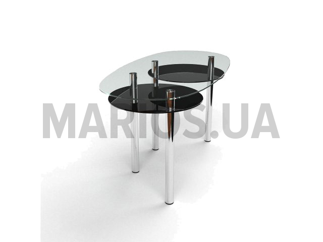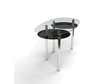 Прозрачная столешница овальной формы и две дополнительные полки круглой формы из черного стекла, делают стол модным и стильным. Благодаря прозрачной столешнице, она пропускает через себя свет, что способствует увеличению пространства комнаты и делает ее светлой и уютной.