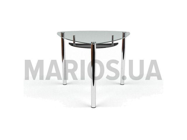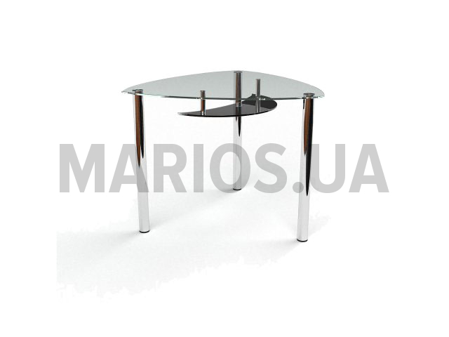 Столешница треугольной формы с закругленными углами, изготовлена из прозрачного закаленного стекла толщиной 8мм. Дополнительная полка в форме полумесяца, изготовлена из стекла толщиной 6мм. В качестве устойчивых опор используется хромированная металлическая труба диаметром 50мм. Опоры крепятся к столешнице, благодаря использованию металлических пятаков.