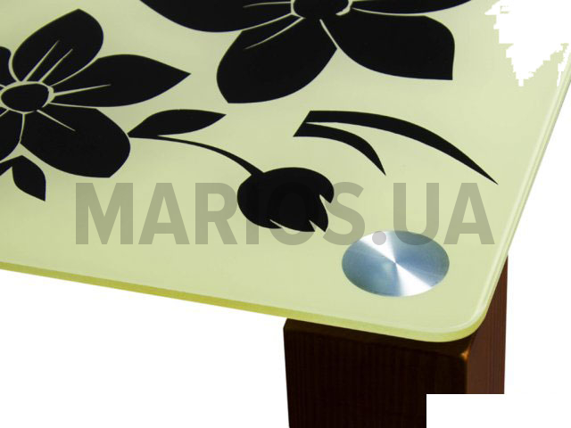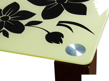 Покраска стекла полуавтоматическая, краска наносится на нижнюю часть столешницы. Она не выгорает, не стирается при активном использовании стола. Металлический пятак (плоский цилиндр), к которому крепятся ножки, приклеен к нижней части столешницы с помощью ультрафиолета. Поэтому даже после длительной эксплуатации стола, он внешний роскошный вид не потеряет. Стол Магнолия изготавливается в четырех размерах: