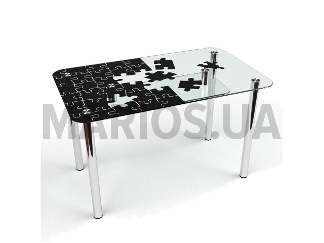 Стол имеет необычный рисунок, который представляет собой рассыпавшиеся пазлы на прозрачной поверхности.