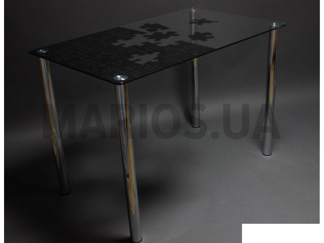 Покраска стекла полуавтоматическая, краска наносится на нижнюю часть столешницы. Она не выгорает, не стирается при активном использовании стола. Металлический пятак (плоский цилиндр), к которому крепятся ножки, приклеен к нижней части столешницы с помощью ультрафиолета. Стол Пазл изготавливается в четырех размерах: <ul style="font-size: 12.222222328186px;"><li>