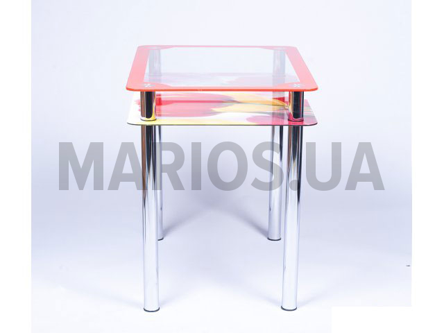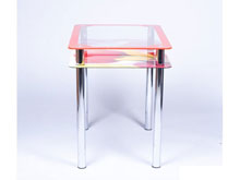 Изготовлен стол из прочных и надежных материалов. Столешница изготовлена из закаленного стекла толщиной 8мм. Такое стекло долговечное, способно выдерживать нагрузку до 500кг. Дополнительная полка такого же размера, как и столешница, изготовлена из стекла толщиной 6мм. Все углы стола закругленные, поэтому травматизм исключен. В качестве устойчивых опор используется металлическая хромированная труба диаметром 50мм.