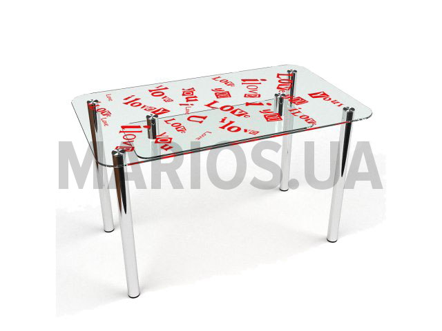 Столешница изготовлена из закаленного стекла толщиной 8мм, способного выдерживать нагрузку до 500кг. В качестве устойчивых опор используется хромированная металлическая труба диаметром 50мм. Опоры крепятся к столешнице, благодаря использованию металлических пятаков.