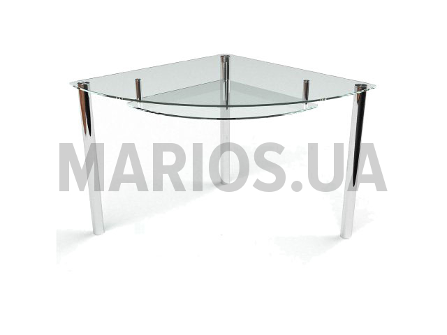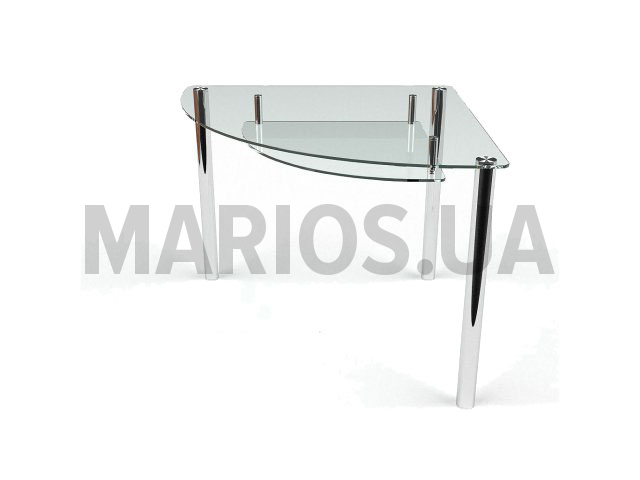 Столик угловой, столешница прозрачная, изготовлена из закаленного стекла толщиной 8мм. Столик функциональный, оснащен дополнительной полкой из прозрачного стекла толщиной 6мм. На нее можно поставить мелкие вещицы необходимые на кухне. Устойчивость стола обеспечивает металлическая хромированная труба диаметром 50мм. Сочетание стекла и металла, делают стол надежным и практичным.