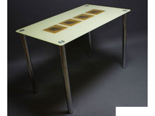 Покраска стекла полуавтоматическая, краска наносится на нижнюю часть столешницы. Она не выгорает, не стирается при активном использовании стола. Металлический пятак (плоский цилиндр), к которому крепятся ножки, приклеен к нижней части столешницы с помощью ультрафиолета. Стол Вихрь изготавливается в четырех размерах: