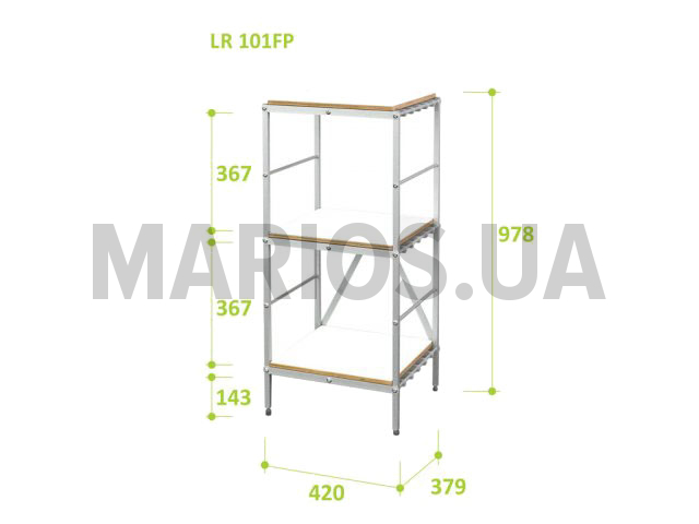 37.90см x 42.00см x 97.80см Характеристики мебели Материал алюминий, фанера Стеллаж Lira LR 101FP Характеристики: Материал каркаса: алюминиевый профиль Материал полок: фанера покрыта пластиком Количество полок: 3 Опоры: регулируемые Высота: 97.8 см Ширина: 42 см Глубина: 37.9 см Высота между полками: 36.7 см Вес: 7.4 кг Максимальная нагрузка: 60 кг Цвет полок: белый Цвет алюминиевого профиля: серебристый Гарантия: 24 месяца
