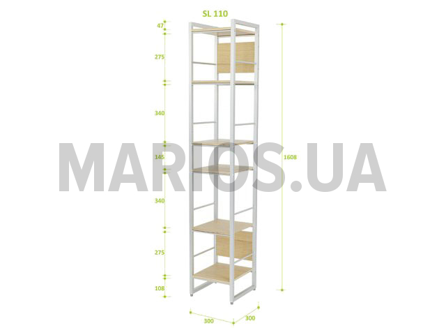 30.00см x 30.00см x 160.80см Характеристики мебели Материалалюминий, ДСП Стеллаж SL110Характеристики:Каркас: алюминийПолки: ДСПРегулируемые опоры.Вес: 8.6 кгДопустимая нагрузка: 60 кгРазмер:Ширина: 30 смГлубина: 30 смВысота: 160.8 см