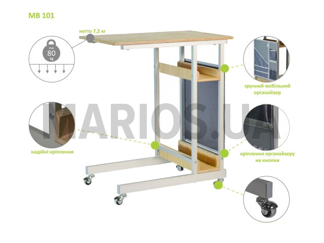 62.00см x 42.00см x 74.50см Характеристики мебели Материал фанера облицована шпоном натурального дуба Стол мобильный Mobi MB 101 Характеристики: Материал каркаса: анодированный алюминий Материал столешницы: фанера облицована шпоном натурального дуба и покрыта масло-воском Опоры: роликовые, съемные Количество полок: 2 Высота: 74.5 см Ширина: 42 см Глубина: 62 см Вес: 7.2 кг Максимальная нагрузка: 80 кг Цвет: дуб светлый Цвет алюминиевого профиля: серебристый Гарантия: 24 месяца