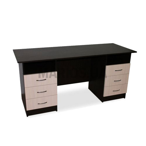 140.00см x 60.00см x 75.00см Характеристики мебели Материал ДСП, ПВХ Практичный Стол ОН 52/1 140х60х75 – удачная покупка в любой офис и домашний кабинет. Стол имеет тумбы с выдвижными ящиками по двум сторонам изделия. Ящики выдвигаются с помощью роликовых направляющих. За дополнительную плату направляющие можно заменить на телескопические. Материал – ДСП 16 мм, кромка деталей изготовлена из ПВХ 0,5 мм. Широкая цветовая гамма, предоставленная производителем, дает возможность выбрать тот цвет и оттенок, который гармонично впишется в интерьер помещения. За дополнительную плату изделие можно выполнить в нестандартном цвете. Материалы: ДСП 16 мм Торцы ПВХ 2, ПВХ 0,5 мм