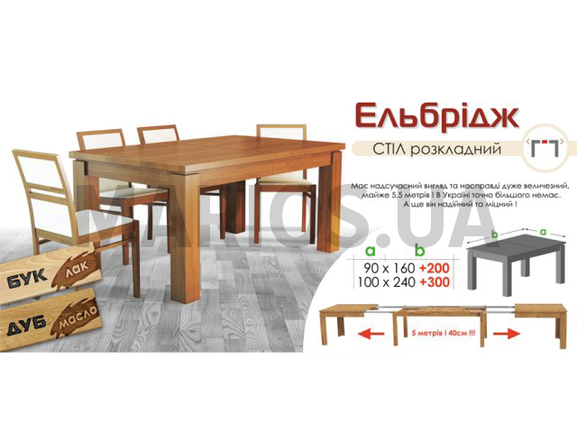 160.00см x 90.00см x 75.00см Вес0.00кг Характеристики мебели МатериалМассив бука. Стол раскладной Эльбридж 90х160-360см – современная модель обеденного стола, длина которого при раскладывании увеличивается на 2 метра. Если у Вас большая семья или многочисленные гости – привычное явление, то Вам просто необходим большой раскладной стол Эльбридж. Классическая прямоугольная форма и незамысловатый дизайн превосходно адаптируют его к любому интерьеру. Главное, чтобы хватило места! Стол изготовлен из натурального дерева – массива бука, имеющего великолепную текстуру и первоклассное качество обработки. А еще он крепкий, надежный и долговечный.Размеры стола Амберг:ширина: 90 см; длина: 160 см; высота ножек: 75 см.Размеры стола в разложенном виде:ширина: 90 см; длина: 360 см.Материал:массив бука.
