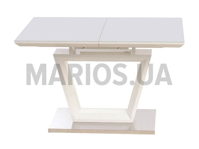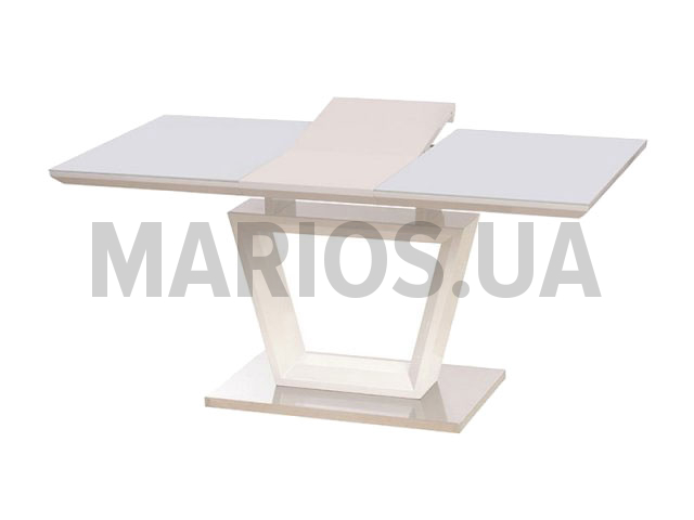 Характеристики мебели Материал МДФ, стекло Стол ТМ-51-1 белый Характеристики: Ширина: 120 см Глубина: 80 см Высота: 76 см Максимальная ширина: 160 см Материал столешницы: мдф+стекло Материал основания: мдф Вид: раскладные Особенность: Столешница: вставка-латте МДФ+капучино стекло. Колонна: капучино МДФ. База: матовая нержавеющая сталь