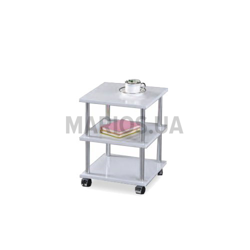 Столик оснащен колесиками. Полки изготовлены из МДФ, корпус - металл.
