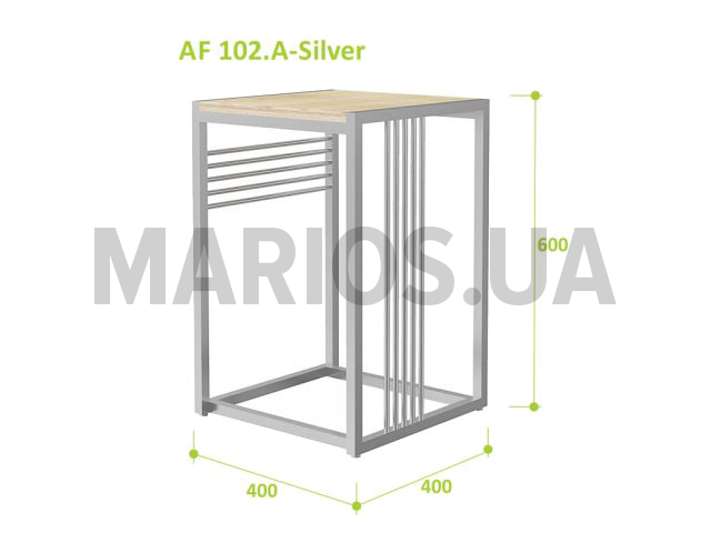 40.00см x 40.00см x 60.00см Характеристики мебели Материалалюминий, фанера облицована шпоном натурального дуба Столик журнальный AF102. А-SilverХарактеристики:Материал каркаса: анодированный алюминийМатериал столешницы: фанера облицована шпоном натурального дуба и покрыта масло-воскомОпоры: роликовые, съемныеВысота: 60 смШирина: 40 смГлубина: 40 смВес: 4.8 кгМаксимальная нагрузка: 80 кгЦвет: дуб светлыйЦвет алюминиевого профиля: серебристыйОсобенности: 2 типа опор в комплектеГарантия: 24 месяца