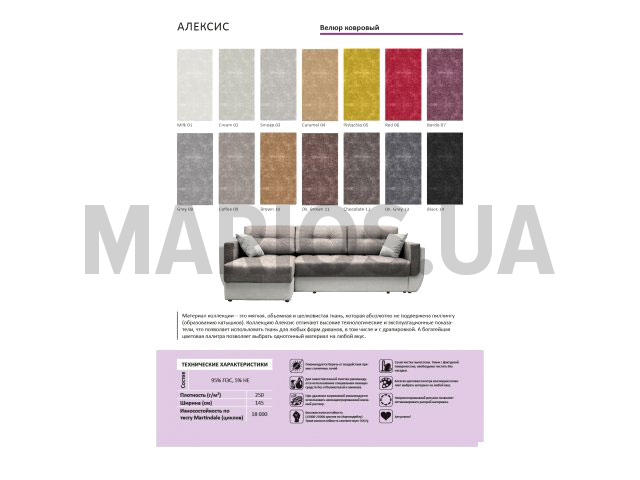 100.00см x 140.00см x 0.00см Характеристики тканей Износостойкость18000 Категория ткани5-я категория Плотность208 г/м.кв ПроизводительКитай Состав100% полиэстер Тип тканивелюр Алексис 02 - велюровая ткань светло-серого цвета, которая обладает прекрасными внешними данными и очень практична в эксплуатации. Состав материала: