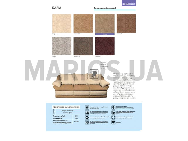 Ткань Бали Mocco 05 устойчива к воздействию когтей домашних питомцев, поэтому о внешнем виде обивки волноваться не стоит.Рекомендуется беречь от солнечных лучей и при удалении загрязнений использовать неконцентрированный мыльный раствор. Состав ткани: лицо: 100% ПЭС, основа - флис.