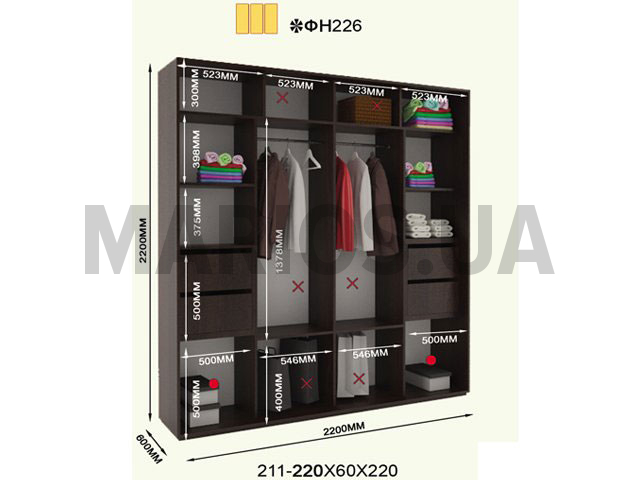 60.00см x 220.00см x 220.00см Характеристики шкафа Количество дверей3 двери Материал корпусаДСП 18мм, кромка ПВХ 0,5 и 2мм Оснащение10 полок, три двери (ДСП или зеркало), 2 отделения для тремпелей Форма шкафалинейный Трехдверный шкаф Фаворит ФН226 220В комплектацию модели входит: 10 полок, два отделения для тремпелей и три двери с профилем Элит в цвете серебро. Двери шкафа могут быть выполнены из ДСП, зеркальные, комбинированные или же с вертикальными делениями. Дополнительно можно заказать бельевой отдел, радиус Ф 45, радиус Ф 60, радиус Ф 35, радиус Ф 50, полку, трубу, стойку. За дополнительную плату. Размеры шкафа: глубина/ширина/высота - 60/211-220/220. Цена указана за шкаф стандартного размера шириной 220 см и высотой 220см. Шкаф с нестандартной шириной от 211 до 219 оплачивается дополнительно. Также возможно изготовление шкафа высотой 250 смМатериалы, из которых изготовлен шкаф: Корпус: ДСП 18мм; Фасады: зеркальные или ДСП; Кромка: ПВХ 0.5 и 2мм; Зеркало: 4 мм; Штанга: микролифт металлический. Профиль: Элит или Квадратный. Цвет: серебро, золото светлое, бронза светлая, венге глянец. Раздвижная система: алюминиевая.