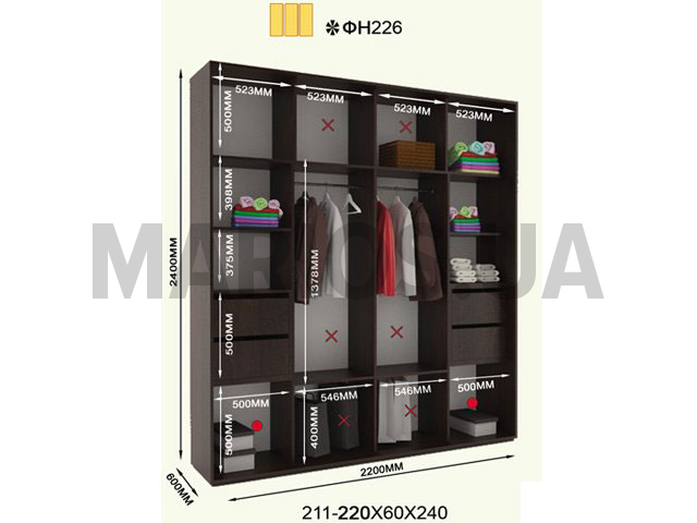 60.00см x 220.00см x 240.00см Характеристики шкафа Количество дверей3 двери Материал корпусаДСП 18мм, кромка ПВХ 0,5 и 2мм Оснащение10 полок, три двери (ДСП или зеркало), 2 отделения для тремпелей Форма шкафалинейный Трехдверный шкаф Фаворит ФН226 240В комплектацию модели входит: 10 полок, два отделения для тремпелей и три двери с профилем Элит в цвете серебро. Двери шкафа могут быть выполнены из ДСП, зеркальные, комбинированные или же с вертикальными делениями. Дополнительно можно заказать бельевой отдел, радиус Ф 45, радиус Ф 60, радиус Ф 35, радиус Ф 50, полку, трубу, стойку. За дополнительную плату. Размеры шкафа: глубина/ширина/высота - 60/211-220/220. Цена указана за шкаф стандартного размера шириной 220 см и высотой 240см. Шкаф с нестандартной шириной от 211 до 219 оплачивается дополнительно. Также возможно изготовление шкафа высотой 250 смМатериалы, из которых изготовлен шкаф: Корпус: ДСП 18мм; Фасады: зеркальные или ДСП; Кромка: ПВХ 0.5 и 2мм; Зеркало: 4 мм; Штанга: микролифт металлический. Профиль: Элит или Квадратный. Цвет: серебро, золото светлое, бронза светлая, венге глянец. Раздвижная система: алюминиевая.