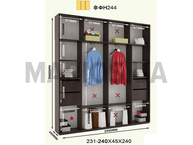 45.00см x 240.00см x 240.00см Характеристики шкафа Количество дверей3 двери Материал корпусаДСП 18мм, кромка ПВХ 0,5 и 2мм Оснащение10 полок, три двери (ДСП или зеркало), 2 отделения для тремпелей Форма шкафалинейный Трехдверный шкаф Фаворит ФН244 240В комплектацию модели входит: 10 полок, два отделения для тремпелей и три двери с профилем Элит в цвете серебро. Двери шкафа могут быть выполнены из ДСП, зеркальные, комбинированные или же с вертикальными делениями. Дополнительно можно заказать бельевой отдел, радиус Ф 45, радиус Ф 60, радиус Ф 35, радиус Ф 50, полку, трубу, стойку. За дополнительную плату. Размеры шкафа: глубина/ширина/высота - 45/231-240/220. Цена указана за шкаф стандартного размера шириной 240 см и высотой 240см. Шкаф с нестандартной шириной от 231 до 239 оплачивается дополнительно. Также возможно изготовление шкафа высотой 250 смМатериалы, из которых изготовлен шкаф: Корпус: ДСП 18мм; Фасады: зеркальные или ДСП; Кромка: ПВХ 0.5 и 2мм; Зеркало: 4 мм; Штанга: микролифт металлический. Профиль: Элит или Квадратный. Цвет: серебро, золото светлое, бронза светлая, венге глянец. Раздвижная система: алюминиевая.