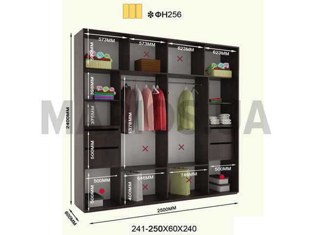 60.00см x 250.00см x 240.00см Характеристики шкафа Количество дверей3 двери Материал корпусаДСП 18мм, кромка ПВХ 0,5 и 2мм Оснащение10 полок, три двери (ДСП или зеркало), 2 отделения для тремпелей Форма шкафалинейный Трехдверный шкаф Фаворит ФН256 240В комплектацию модели входит: 10 полок, два отделения для тремпелей и три двери с профилем Элит в цвете серебро. Двери шкафа могут быть выполнены из ДСП, зеркальные, комбинированные или же с вертикальными делениями. Дополнительно можно заказать бельевой отдел, радиус Ф 45, радиус Ф 60, радиус Ф 35, радиус Ф 50, полку, трубу, стойку. За дополнительную плату. Размеры шкафа: глубина/ширина/высота - 60/241-250/220. Цена указана за шкаф стандартного размера шириной 250 см и высотой 240см. Шкаф с нестандартной шириной от 241 до 249 оплачивается дополнительно. Также возможно изготовление шкафа высотой 250 смМатериалы, из которых изготовлен шкаф: Корпус: ДСП 18мм; Фасады: зеркальные или ДСП; Кромка: ПВХ 0.5 и 2мм; Зеркало: 4 мм; Штанга: микролифт металлический. Профиль: Элит или Квадратный. Цвет: серебро, золото светлое, бронза светлая, венге глянец. Раздвижная система: алюминиевая.