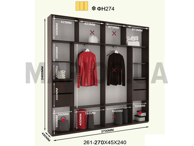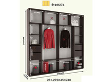 45.00см x 270.00см x 240.00см Характеристики шкафа Количество дверей3 двери Материал корпусаДСП 18мм, кромка ПВХ 0,5 и 2мм Оснащение10 полок, три двери (ДСП или зеркало), 2 отделения для тремпелей Форма шкафалинейный Трехдверный шкаф Фаворит ФН274 240В комплектацию модели входит: 10 полок, два отделения для тремпелей и три двери с профилем Элит в цвете серебро. Двери шкафа могут быть выполнены из ДСП, зеркальные, комбинированные или же с вертикальными делениями. Дополнительно можно заказать бельевой отдел, радиус Ф 45, радиус Ф 60, радиус Ф 35, радиус Ф 50, полку, трубу, стойку. За дополнительную плату. Размеры шкафа: глубина/ширина/высота - 45/261-270/220. Цена указана за шкаф стандартного размера шириной 270 см и высотой 240см. Шкаф с нестандартной шириной от 261 до 269 оплачивается дополнительно. Также возможно изготовление шкафа высотой 250 смМатериалы, из которых изготовлен шкаф: Корпус: ДСП 18мм; Фасады: зеркальные или ДСП; Кромка: ПВХ 0.5 и 2мм; Зеркало: 4 мм; Штанга: микролифт металлический. Профиль: Элит или Квадратный. Цвет: серебро, золото светлое, бронза светлая, венге глянец. Раздвижная система: алюминиевая.