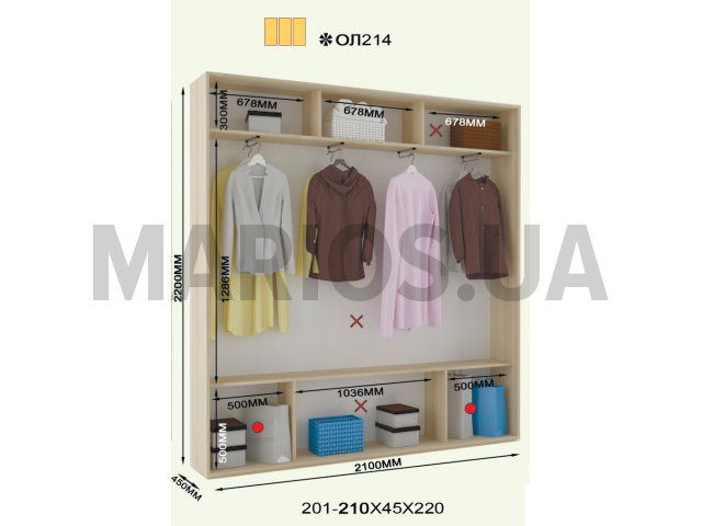 210.00см x 45.00см x 220.00см Характеристики шкафа Количество дверей3 двери Материал корпусаДСП 18мм, кромка ПВХ 0,5 и 2мм Оснащение6 полок, три двери (ДСП или зеркало), 4 отделения для тремпелей Форма шкафалинейный Трехдверный шкаф-купе ОЛ 214 220.В комплектацию модели входит: 6 полок, 4 отделения для тремпелей и три двери с профилем Элит в цвете серебро. Двери шкафа могут быть выполнены из ДСП, зеркальные, комбинированные или же с вертикальными делениями. Размеры шкафа: глубина/ширина/высота - 45/201-210/220.Цена указана за шкаф стандартного размера шириной 200см. Шкаф с нестандартной шириной от 201 см до 209 см оплачивается дополнительно. Также возможно изготовление шкафа высотой 250см. Материалы, из которых изготовлен шкаф-купе ОЛ 214 220: Корпус: ДСП 18мм; Фасады: зеркальные и панельные; Кромка: ПВХ 0.5 и 2мм; Зеркало: 4 мм; Штанга: микролифт металлический. Профиль: Элит или Квадратный. Цвет: серебро, золото светлое, бронза светлая, венге глянец. Раздвижная система: алюминиевая.