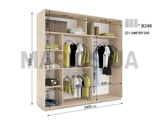 60.00см x 240.00см x 240.00см Характеристики шкафа Количество дверей3 двери Материал корпусаДСП 18мм, кромка ПВХ 0,5 и 2мм Оснащение6 полок, три зеркальные двери с пескоструем Форма шкафалинейный Трехдверный шкаф-купе В246 с пескоструем - это элитная современная модель с оригинальным дизайном, в которую можно вместить очень много нужных вещей и при этом украсить свой интерьер.В комплектацию шкафа входит: 6 полок, три отделения для тремпелей и три двери с профилем Элит в цвете серебро. Есть возможность установить блок В50.Двери шкафа зеркальные, украшенные пескоструем, где Вы сможете выбрать узор из ста рекомендованных вариантов, или предложить свой макет для дизайна. Размеры шкафа: глубина/ширина/высота - 60/231-240/240. Цена указана за шкаф стандартного размера шириной 240см. Шкаф с нестандартной шириной от 231см до 239см оплачивается дополнительно. Также возможно изготовление шкафа высотой 250см. Пескоструйная обработка - это холодная абразивная обработка поверхности стекла путем повреждения ее поверхности песком или иным абразивным порошком, распыляемым потоком воздуха, или декоративное матирование стекла.Материалы, из которых изготовлен шкаф-купе В246 с пескоструем: Корпус: ДСП 18мм; Фасады: зеркальные с пескоструем; Кромка: ПВХ 0.5 и 2мм; Зеркало: 4 мм; Штанга. Профиль: Элит или Квадратный. Цвет: серебро, золото светлое, бронза светлая, венге глянец. Раздвижная система: алюминиевая. Стандартные цвета в складской программе: венге магия; яблоня Локарно; ольха горная; дуб молочный; белый; орех лесной. Срок изготовления шкафов в стандартной цветовой гамме составляет 3-4 дня. Стандартные цвета, не входящие в складскую программу: орех темный. Срок изготовления шкафов в этих цветах составляет 10 дней. Нестандартные цвета: дуб арканзас темный. Шкафы в нестандартных цветах изготавливаются за дополнительную плату в течении 10 дней. Данные цвета не используются для фасадов.