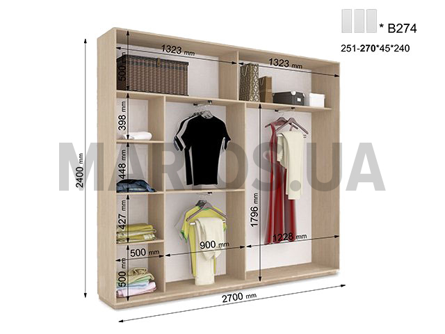 45.00см x 270.00см x 240.00см Характеристики шкафа Количество дверей3 двери Материал корпусаДСП 18мм, кромка ПВХ 0,5 и 2мм Оснащение6 полок, три зеркальные двери с пескоструем, 3 микролифта Форма шкафалинейный Трехдверный шкаф-купе В274 с пескоструем - это необычный, современный и очень вместительный шкаф, который будет компактно хранить Ваши вещи и украшать собой интерьер.В комплектацию шкафа входит: 6 полок, три отделения для тремпелей с тремя микролифтами и три двери с профилем Элит в цвете серебро. Есть возможность установить блок В35.Двери шкафа зеркальные, украшенные пескоструем, где Вы сможете выбрать узор из ста рекомендованных вариантов, или предложить свой макет для дизайна. Размеры шкафа: глубина/ширина/высота - 45/251-270/240. Возможно выполнение шкафов высотой 250см за дополнительную плату. Пескоструйная обработка - это холодная абразивная обработка поверхности стекла путем повреждения ее поверхности песком или иным абразивным порошком, распыляемым потоком воздуха, или же декоративное матирование стекла.Материалы, из которых изготовлен шкаф-купе В274 с пескоструем: Корпус: ДСП 18мм; Фасады: зеркальные с пескоструем; Кромка: ПВХ 0.5 и 2мм; Зеркало: 4 мм; Штанга: микролифт металлический. Профиль: Элит или Квадратный. Цвет: серебро, золото светлое, бронза светлая, венге глянец. Раздвижная система: алюминиевая. Стандартные цвета в складской программе: венге магия; яблоня Локарно; ольха горная; дуб молочный; белый; орех лесной. Срок изготовления шкафов в стандартной цветовой гамме составляет 3-4 дня. Стандартные цвета, не входящие в складскую программу: орех темный. Срок изготовления шкафов в этих цветах составляет 10 дней. Нестандартные цвета: дуб арканзас темный. Шкафы в нестандартных цветах изготавливаются за дополнительную плату в течении 10 дней. Данные цвета не используются для фасадов.