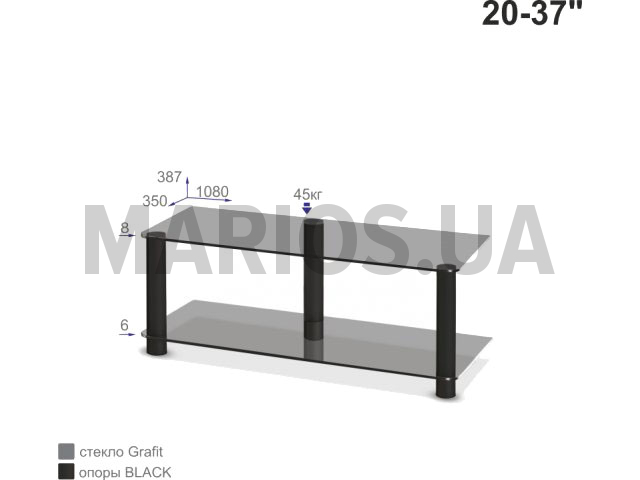 34.50см x 108.00см x 38.70см Характеристики мебели Материал стекло, металл Тумба из стекла под телевизор Commus Аскет mini Характеристики: Максимальная диагональ телевизора: 37 (дюймов) Максимально допустимая нагрузка: 30 кг Цвет: черный. Размер тумбы: Ширина: 108 см Глубина: 34.5 см Высота: 38.7 см Материал: Полки - стекло, 8 и 6 мм. Ножки - металл, диаметром 60 мм.