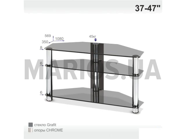 35.00см x 108.00см x 56.90см Характеристики мебели Материалстекло, металл Тумба из стекла под телевизор Евро New ChromeХарактеристики:Максимальная диагональ телевизора: 47 (дюймов)Максимально допустимая нагрузка: 45 кгЦвет: графит.Размер тумбы:Ширина: 108 смГлубина: 35 смВысота: 56.9 смМатериал:Полки - калёное стекло 8/6/6 мм.Ножки - металл.