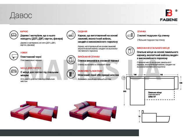 203.00см x 272.00см x 75.00см Вес0.00кг Характеристики дивана (кресла, тахты, углового дивана) Механизм трансформацииеврокнижкаОснова сидениявысококачественный пенополиуретан Vita , Польша.Размер спального места137х225ВидраскладнойКомплектацияниша для белья, 2 декоративные подушкиБельевой ящикесть Угловой диван Davos Современный удобный лаконичный раскладной диван с двумя подушками и ящиком для белья. Сидение на основе ламелей, войлока, пружинного блока, высококачественного поролона - все для долгой и безупречной работы. Механизм трансформации - еврокнижка. Обивка любой тканью на выбор. Возможен левый или правый монтаж при сборке. Характеристики: Длина дивана: 272 см Глубина дивана: 203 см Высота посадочной части дивана: 43 см Высота дивана с учетом спинки: 75 см Длина спального места: 225 см Ширина спального места: 137 см Каркас: натуральное дерево, ДСП, ДВП, ламели. Основание спального места: ДСП, пружинный блок, деревянные ламели, войлок. Опоры: дерево. Подушка сидения и спинки: высококачественный пенополиуретан Vita, Польша.