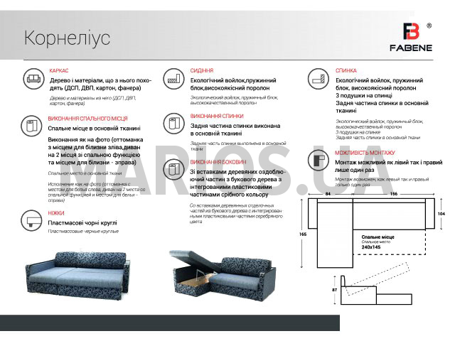 165.00см x 240.00см x 87.00см Вес0.00кг Характеристики дивана (кресла, тахты, углового дивана) Механизм трансформацииеврокнижкаОснова сидениявысококачественный пенополиуретан Vita , Польша.Размер спального места145х240ВидраскладнойБельевой ящикесть Угловой диван Корнелиус Раскладной угловой диван в классическом исполнении с двумя вместительными ящиками для белья. Сидение на основе ламелей, войлока, пружинного блока, высококачественного поролона - все для долгой и безупречной работы. Конструкция спинки дополнительно оснащена эластичными резиновыми пасами. Обивка любой тканью на выбор. Возможен левый или правый монтаж при сборке. Характеристики: Длина дивана: 240 см Глубина дивана: 165 см Высота дивана с учетом спинки: 87 см Длина спального места: 240 см Ширина спального места: 145 см Каркас: натуральное дерево, ДСП, ДВП. Основание спального места: ДСП, пружинный блок. Опоры: пластмасса. Подушка сидения и спинки: высококачественный пенополиуретан Vita, Польша.