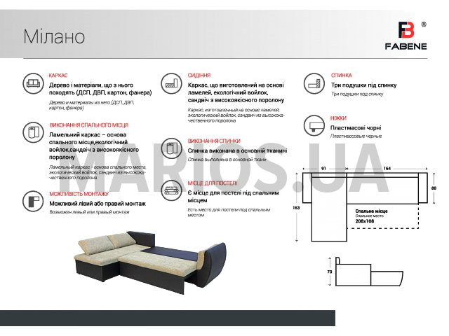 163.00см x 255.00см x 70.00см Вес0.00кг Характеристики дивана (кресла, тахты, углового дивана) Механизм трансформацииеврокнижкаОснова сидениявысококачественный пенополиуретан Vita , Польша.Размер спального места108х208ВидраскладнойБельевой ящикесть Угловой диван Милано Характеристики: Длина дивана: 255 см Глубина дивана: 163 см Высота дивана с учетом спинки: 70 см Длина спального места: 208 см Ширина спального места: 108 см Каркас: натуральное дерево, ДСП, ДВП. Основание спального места: ДСП, пружинный блок. Опоры: пластмасса. Подушка сидения и спинки: высококачественный пенополиуретан Vita, Польша.