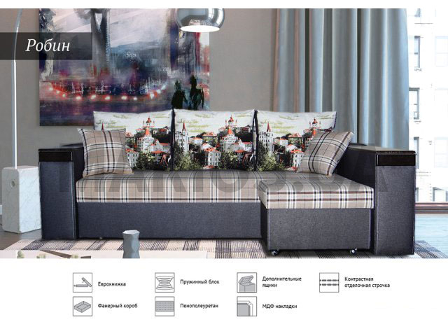 250.00см x 165.00см x 0.00см Вес120.00кг Характеристики дивана (кресла, тахты, углового дивана) Механизм трансформацииеврокнижкаОснова сиденияпружинный блок, пенополиуретан, фанерный коробРазмер спального места160x200смБельевой ящикесть Характеристики мебели Страна производительУкраина Угловой диван Робин фабрики Диванофф станет находкой для современного интерьера и обеспечит полноценным двуспальным местом, благодаря современному механизму "еврокнижка". Модель очень практичная, так как оснащена не только вместительным коробом для белья, но и дополнительными ящиками, скрытыми в подлокотниках под прочными МДФ накладками. Робин элегантно украшен контрастной отделочной строчкой, поэтому внешний вид дивана очень современный и прекрасно подойдет к любому интерьеру. Декорировано изделие замечательными подушками в количестве пяти штук различного размера, что дарит особый комфорт и гармонию. Плюс к этому, огромный выбор обивочной ткани дает возможность подобрать нужную расцветку и структуру ткани, которая подойдет к дизайну именно Вашей квартиры. А также, Вы сможете подобрать сочетание подушек, выбирая тот рисунок, который Вам понравится больше всего. Мебельная фабрика Диванофф разработала 5 основных комбинаций тканей, которые поддерживаются на складе, т.е. купить диван Робин можно в течении 1-3 дней.В обивке дивана Робин могут применяться ткани из каталога Обивочные ткани
